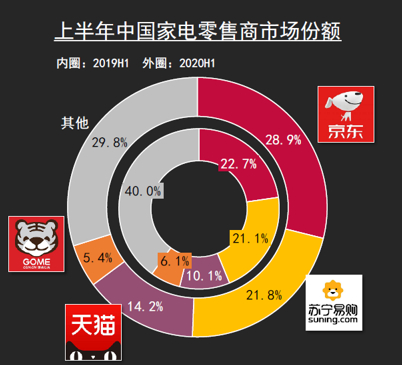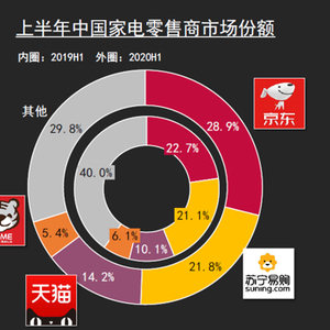 其中,在家电市场上,2020年上半年,京东在中国家电零售市场份额的占比为28.9%,较上年同期增长6.2个百分点,继续居于行业首位。同时,领先于行业第二位的平台7.1个百分点,这一领先优势较上年同期进一步扩大。