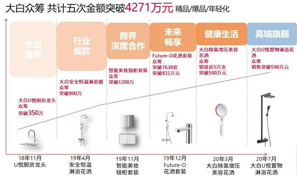 公司推出的首款众筹产品 – U悦感应厨房龙头在“小米有品”上一炮而红,仅仅14天众筹达成率就超过1000%,成为了“2018年卫浴界电商爆品小黑马”。大白科技原本仅当做一次宣传“试水”,准备了4000份成品,出乎意料竟成为小米生态链里的一次爆款,最后成功售出6000套,超额50%完成了它首次的亮相。