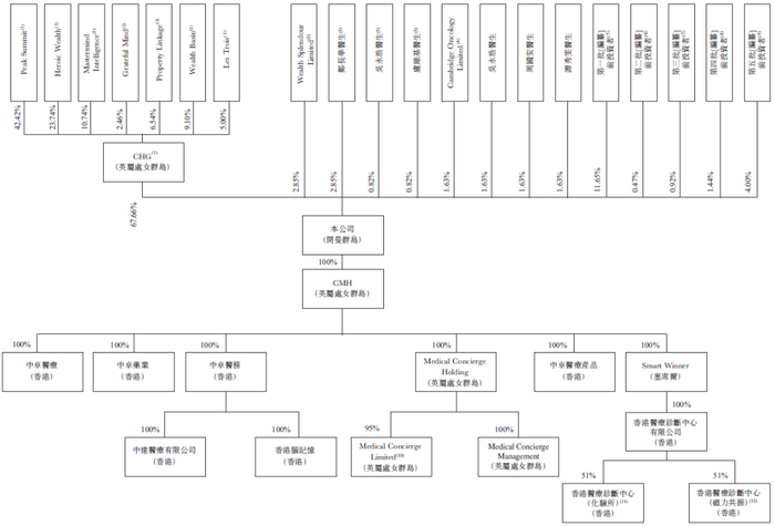 招股书显示,中卓医务在上市前的股东架构中,控股股东为CHG,其持有67.66%的股份。CHG,则由Peak Summit(曾华德医生全资拥有)持股42.42%、Heroic Wealth(梁永雄医生全资拥有)持股23.74%、Mastermind Intelligence(方嘉扬医生全资拥有)持股10.74%、Grateful Mind(朱亮荣医生全资拥有)持股2.46%、Property Linkage(曾淑钧医生全资拥有)持股6.54%、Wealth Basin(萧恕明先生全资拥有)持股9.10%及Les Trois(陈周薇薇女士全资拥有)持股5.00%,他们为一致行动人。