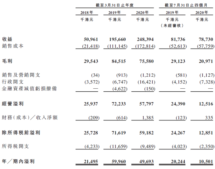 招股书显示,在过去的2018年、2019年、2020年三个财政年度和2020年前四个月(财政年结日为3月31日),中卓医务的营业收入分别为 0.51亿 、1.96亿、2.48亿和0.79亿港元,相应的净利润分别为2,149.5万、5,996.0万、4,969.3万和 1,050.1万港元。