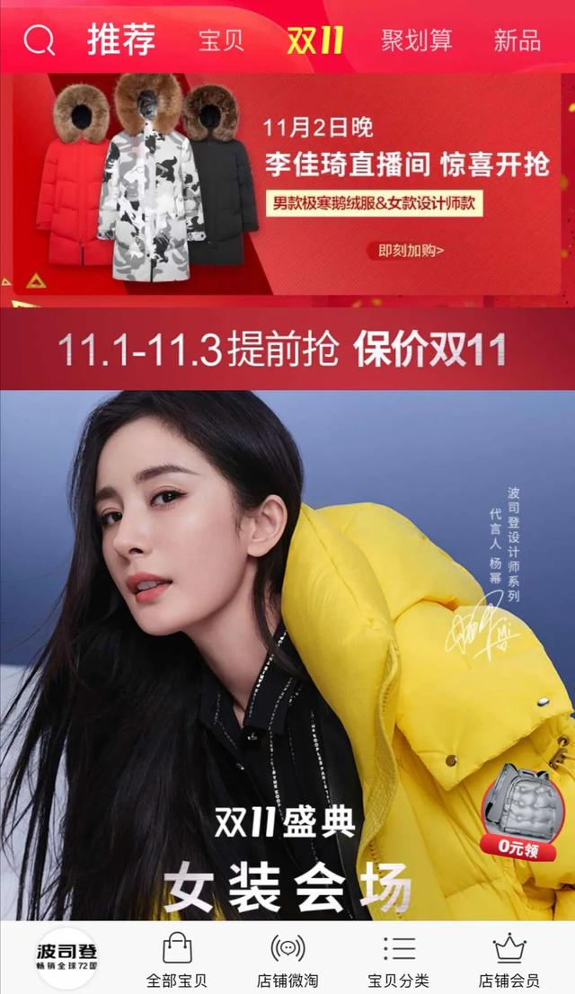 进入波司登天猫旗舰店,首页上端是李佳琦的直播预告,下端是杨幂、陈伟霆两人代言的轮播。一手打着明星牌,另一手打起主播牌,波司登想要的无非是声量、销量的双重保证。