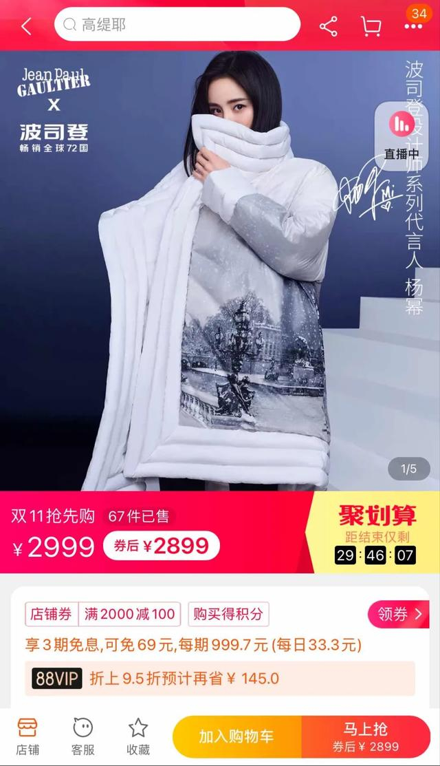 10月9日,波司登与杨幂续约,一天后便官宣签下陈伟霆,给予跟杨幂同样的title:波司登设计师系列代言人;10月28日,波司登发布高缇耶联名合作高定款;10月20日、11月2日,波司登两度进入李佳琦直播间。11月3日,波司登与另一头部主播雪梨合作。