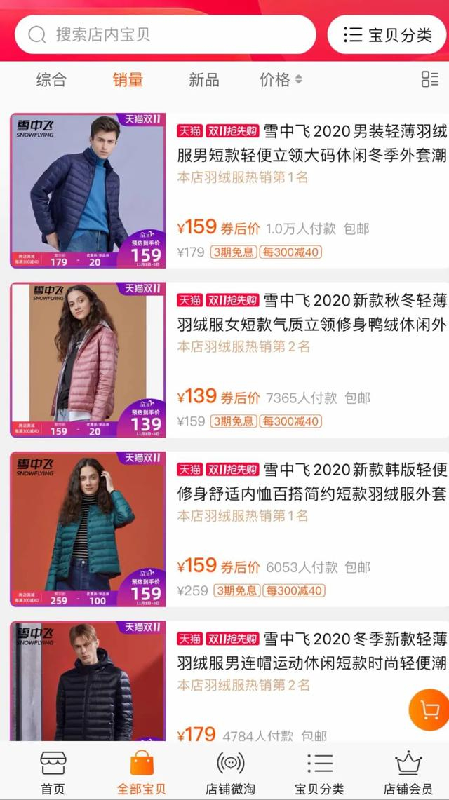 雪中飞天猫旗舰店销量排名(截止11月2日)