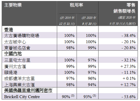 2020年第三季度零售物业中,香港太古广场购物商场租用率为100%,零售销售额降38.4%;香港太古城中心租用率为100%,零售销售额降20.1%,东荟城名店会租用率为99%,零售销售额降20.8%。
