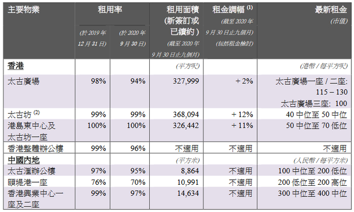2020年第三季度办公楼物业中,香港太古广场租用率为94%,租用面积(新签订或已续约)为32.8万平方尺,租金调幅2%;香港太古坊租用率为99%,租用面积(新签订或已续约)36.8万平方尺,租金调幅12%;港岛东中心及太古坊一座租用率为100%,租用面积(新签订或已续约)32.6万平方尺,租金调幅11%;香港整体办公楼租用率为96%。