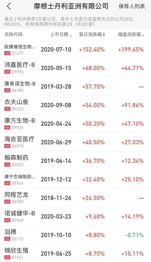 另外徳琪医药的保荐人摩根士丹利过往有着优秀的战绩。根据资料,摩根士丹利最近2年共保荐25家公司,其中上市首日收益率为正的公司占比为68%,所有保荐商中排名第24,其中包括欧康维视生物-B、农夫山泉、沛嘉医疗-B、康方生物-B、康希诺生物-B等大牛股。可供投资者们参考。