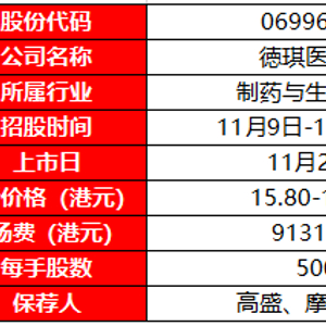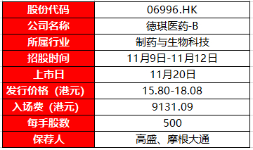又一只创新药公司将登陆港交所,德琪医药已于11月9日开始在香港进行公开募股(IPO),计划筹资至多2亿美元,并已邀请高盛和摩根大通承销股票发行。