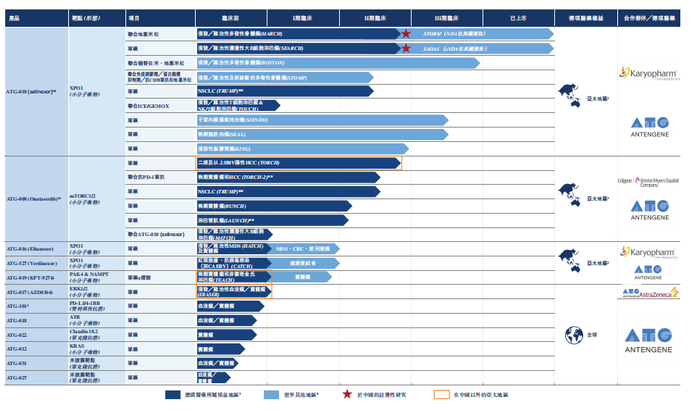 德琪医药已建成12款创新药在研的产品管线,其中2款进入晚期临床试验阶段、4款处于早期临床试验阶段,6款处于临床前研究阶段。这些管线大部分为引进项目,合作伙伴包括Karyopharm和阿斯利康等。德琪医药核心产品为ATG-010和ATG-008。