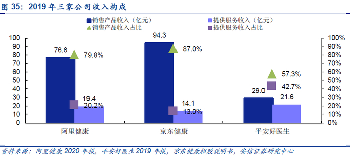 从三家公司的状况看,均与母公司集团的协同上存在优势。京东健康背靠京东,阿里健康背靠阿里集团,两者在医药供应链上有绝对的优势,另外他们可以借助母公司集团的人才和核心技术,增强数字化赋能。平安好医生依托中国平安,其特色为线下医疗健康服务(例如专家挂号、线下转诊等),与线下医疗机构的合作也便更为密切。一、业务对比:京东健康和阿里健康更聚焦医药电商