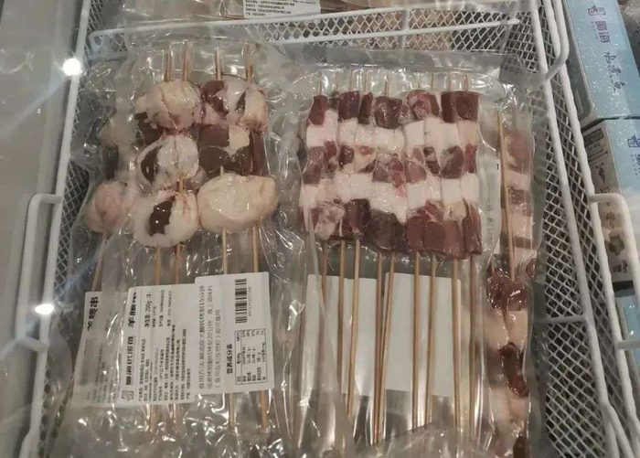 除了火锅食材,冰柜里还有部分烧烤用的食材,有牛肉串、羊肉串、羊腰串、羊板筋串,还有可以直接煎着吃的法切羊排。