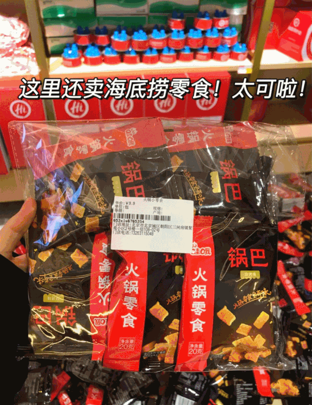 此外还有锅具区、包装区,以及海底捞零食区。海底捞的爆款小食锅巴、爆米花、三角脆,既可以三种混装,还能单独购买一大包,价格为9.9元。
