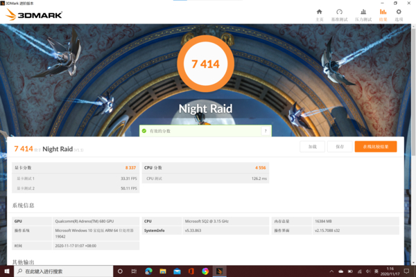 在3D Mark办公环境基准测试中,Surface Pro X升级版跑分为7414分,相当于2020年商务办公笔记本的水平,这意味着它完全可以用于处理各类文件文档以及胜任简单的PS工作。