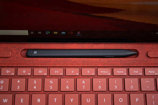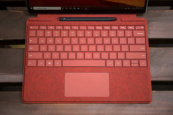 键盘是Surface Pro X升级版的一大亮点,但这款笔记本电脑配的是波比红配色。与之前黑色版本不同,这一配色的键盘还带有类似大理石的纹路,搭配Alcantara欧缔兰材质,因此这款波比红键盘相比黑色会更有质感。