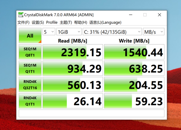 固态读写速度测试部分,我采用CrystalDiskMark进行测试,Surface Pro X升级版在普通模式下的顺序读取和写入速度分别为2319.15MB/s和1540MB/s。在4K文件多线程读写速度上,读取速度为560.13MB/s,写入为204.55MB/s,这部分表现尚可,意味着在正常使用下,你可以快速打开文件,读取内容。