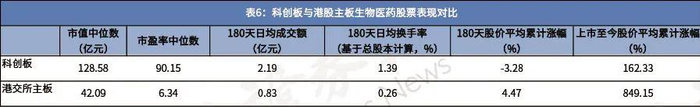从近期股价涨幅来看,港交所主板的生物医药股票过去180天平均累计上涨4.5%,而同期科创板生物医药股票平均累计下跌3.3%。