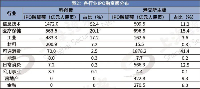 过去一年多来,科创板的上市群体高度集中于信息技术和生物医药两大领域,其中生物医药企业的IPO数量占比22%,融资额占比20%。相较而言,港交所主板同期新上市公司中,行业分布以可选消费为主,其中生物医药企业IPO数量及融资额均占比15%。