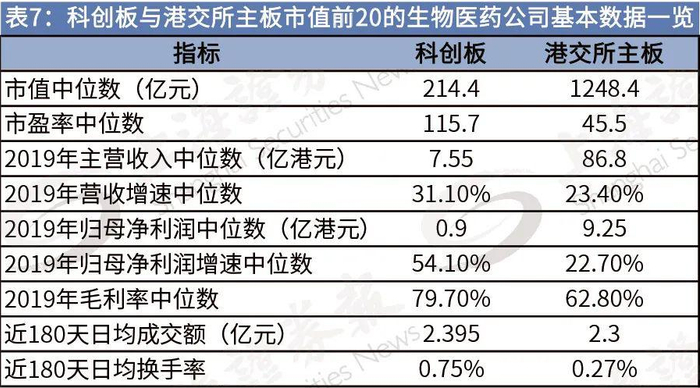 截至2020年11月17日,科创板市值前20的生物医药公司市值中位数为214亿元人民币,其中华熙生物、康希诺、君实生物三家公司总市值均超过500亿元人民币;而港交所主板市值前20的生物医药公司市值中位数高达1248亿港元,其中有12家市值逾千亿港元。