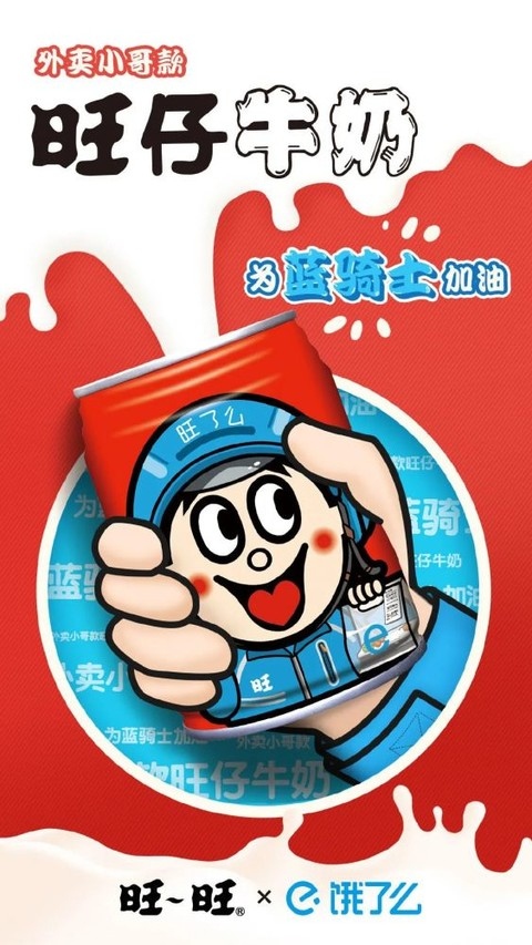 就此可以看到,旺仔和饿了么在物料设计方面下足了功夫,将包装细节做到极致:通过将饿了么骑士与旺仔形象充分融合,营造视觉冲击力,赋予瓶身致敬骑士的仪式感,传递蓝色骑士的正能量,最终为产品增加更多的联名附加价值。