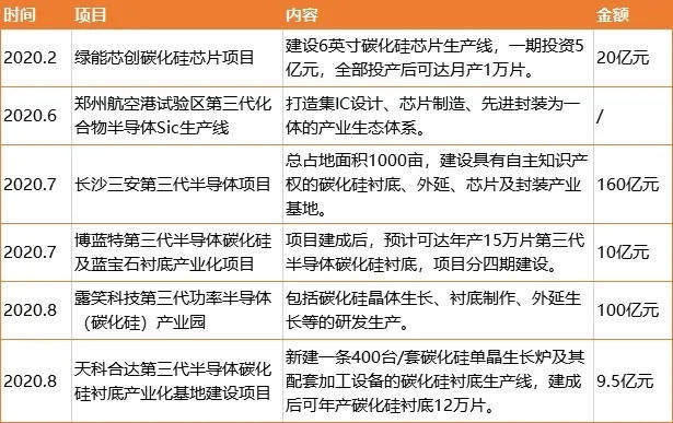 据创业邦不完全统计,2020年已经披露的新开工以及新签约碳化硅项目的投资总额超过300亿元,包括两家上市公司三安光电与露笑科技。