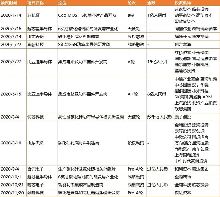 据创业邦不完全统计,截至2020年11月,今年国内碳化硅领域的投资事件也已经达到12起,延续了去年的火热程度。