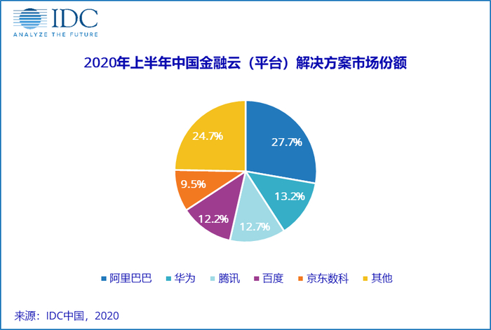 国际数据公司(IDC)最新发布的《中国金融云市场(2020上半年)跟踪》报告显示,尽管受到特殊时期影响,金融云市场在本周期内依然维持了良好的增长,同比增长37.5%。引人注目的是,京东数科T1金融云进入金融云平台解决方案市场前五名,在中国金融云(平台)解决方案市场上占据了9.5%的市场份额。
