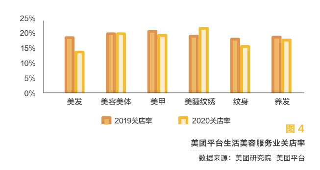 《报告》显示,2020年美业店关店率从2019年的19.7%下降为17.5%。其中美发、文身、美甲、养发店的关店率都低于2019年,尤其是美发店,关店率从19.1%下降为14.8%,也从侧面体现了美发需求更加刚性,几乎没有受到疫情影响。