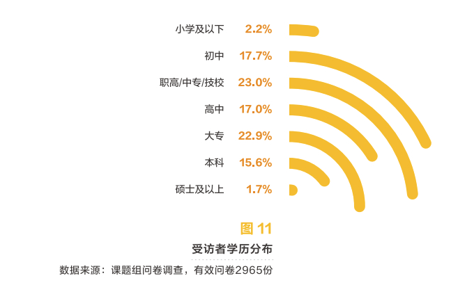 越来越多具有高等教育学历的从业者投身于生活美容服务业事业中。问卷调查结果显示,具有高中、中专及以下学历的从业者的占比为59.9%,具有大专以上学历的从业者的占比超过 40%,其中有 1.6% 的受访者的学历为硕士及以上。