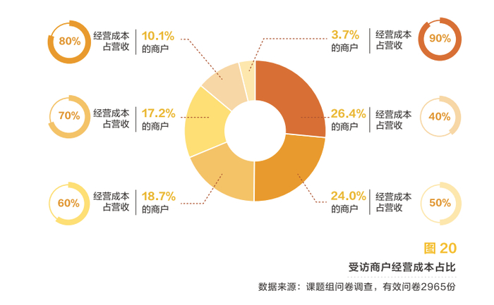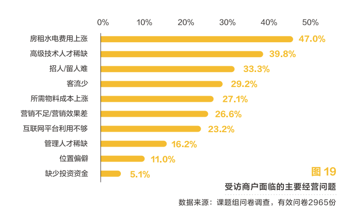 《报告》显示,有近50%的商户认为房租水电费上涨是最美业商户面临的最大困难。有一半以上受访商户表示经营成本(门店租金、人工工资、水电费、物料费等)占其门店营收的40~50%,其余商户都认为,经营成本占据了营收的50%以上。