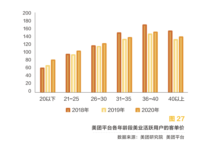 从年龄结构来看,随着年龄的增长,用户平均客单价也随之增加,36~40岁年龄段用户的消费能力最强、平均客单价最高,2020年该年龄段用户的平均客单价达到141元。