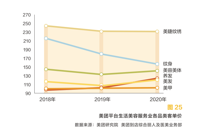 美团平台大数据显示,与2018年相比,2020年养发客单价提升了26.4%,美甲、美发客单价分别提升了4.4%、2.9%。2018年以来,美睫纹绣、美容美体、纹身的客单价有较为明显的下降,其中美睫纹绣客单价下降5.0%,美容美体客单价下降3.9%。