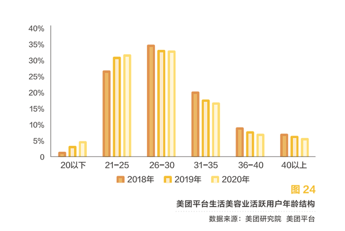 2020年,美业活跃用户年龄分布主要集中在21~25岁、26~30岁、31~35岁三个年龄段,美业用户的年龄普遍较为年轻。2018~2020年三年间,21~25岁用户增加最多,20岁以下的用户也出现较快增长。