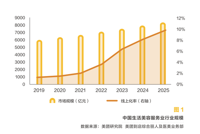 2020年中国生活美容服务业的市场规模约为6373亿元,线上化率只有1.5%,有巨大提升空间。预计到2025年,中国生活美容服务业的市场规模将达到8375亿元,线上化率提升到9.6%左右。