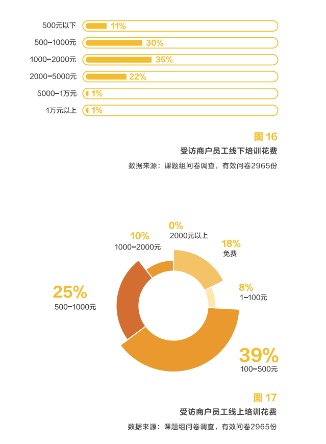 生活美容服务业从业者在培训上不仅投入了大量时间,还付出了大量金钱。就线下培训看,近九成培训的单次花费在500元以上,近六成培训的单次花费超过1000元,有1.4%的培训单次花费超过5000元。线上培训的花费相对较少,有18%是免费培训,有35.2%的培训单次花费在500元以上。