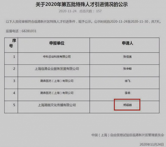 近日上海自贸区临港新片区管委会官网公布一份《2020年第五批特殊人才引进情况的公示》名单,上面除了一些普通人不知道的企业和名字之外,还有杨超越,引起了巨大的争议,一度冲上微博热搜。