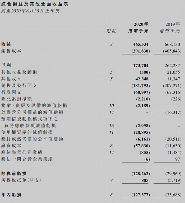 受疫情影响传递娱乐在过去的一年业绩并不理想。截止6月30日的2020年财报数据显示其实现营业收入4.66亿港元,同比2019财年的6.69亿港元大幅下降;年内亏损1.27亿港元,相比较于2019财年的0.36亿港元大幅上升。