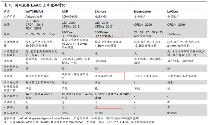 2)先健科技左心耳封堵器LAmbre产品线丰富