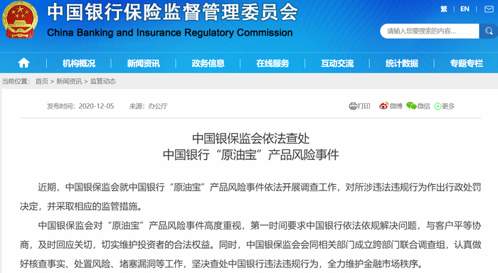 中国银保监会对"原油宝"产品风险事件高度重视,第一时间要求中国银行依法依规解决问题,与客户平等协商,及时回应关切,切实维护投资者的合法权益。同时,中国银保监会会同相关部门成立跨部门联合调查组,认真做好核查事实、处置风险、堵塞漏洞等工作,坚决查处中国银行违法违规行为,全力维护金融市场秩序。