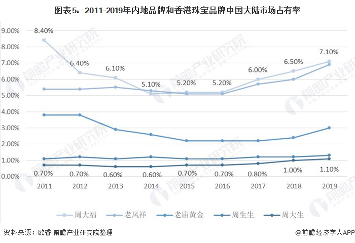 在内地和港资品牌中,在大陆市场周大福的市场占有率一直领先,2014年周大福的市场占有率被老凤祥赶超;2015年,周大福再次回到行业第一的位置,并保持到2019年。