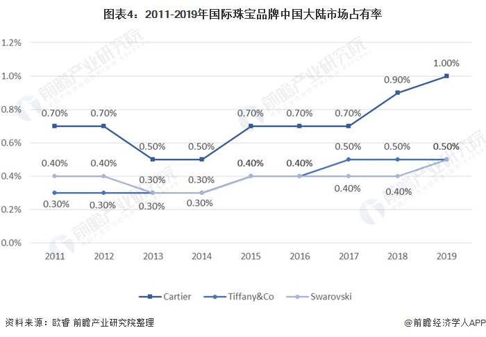 国际珠宝品牌中,卡地亚(Cartier)、蒂凡尼(Tiffany&Co)和施华洛世奇(Swarovski)在中国大陆市场中占有的市场份额高于其他国际品牌。其中,卡地亚(Cartier)的市场占有率最高,2019年,卡地亚中国大陆市场占有率为1%。蒂芙尼和施华洛世奇持平0.5%。