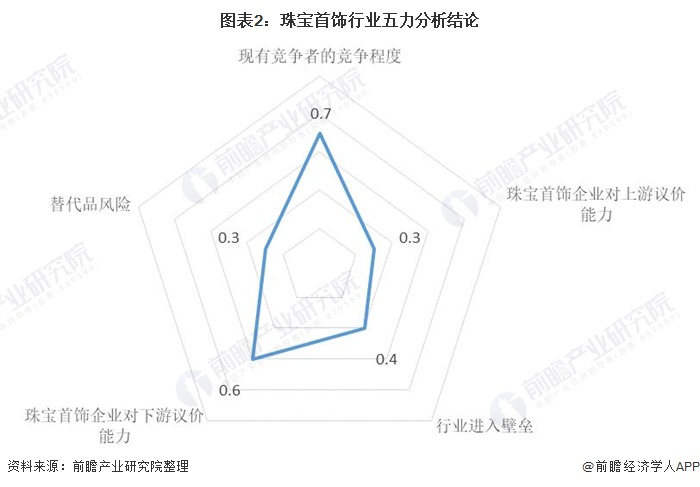 宝石(钻石,翡翠,宝石等)作为珠宝产业的原材料都是稀有资源,上游的资源拥有者或者垄断者具有很强的话语权,而且如黄金等硬通货价格公开,珠宝商不具有谈判能力,上游议价能力低。因为珠宝消费大部分是情感消费,对于价格的敏感度低,所以因为市场需求珠宝首饰企业对下游的议价能力一般。潜在进入者对珠宝首饰行业现有的企业威胁较弱,珠宝首饰行业的吸引力一般,同时存在较高的进入壁垒,现有企业凭借其市场优势对潜在进入者有一定挤压。从替代品的威胁来看,珠宝首饰行业产品品类基本相同,同质性相对较高,小品牌小企业生存空间愈来愈小,将会被替代或淘汰。最终,国内的珠宝首饰是少数寡头竞争的结局。