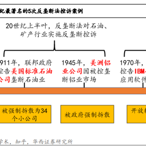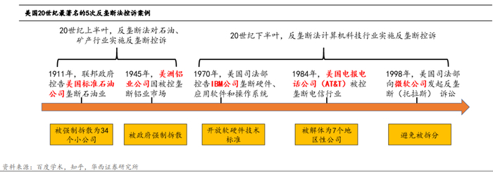 20世纪出现了包括美国标准石油、美洲铝业公司、IBM、AT&T、微软公司在内的五反托拉斯事件,其中的前四个案例,被控告垄断的企业最终不是被拆解就是被要求开放其垄断的市场,而只有在“合众国诉微软”一案中,双方最后达成了和解。