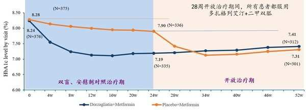 2020年7月,华领医药宣布黎明研究在双盲试验期达到主要疗效和安全性终点,具有良好的安全性和耐受性,疗效显著。整个52周治疗的疗效和安全性结果基于核心数据分析。28周开放治疗期间,原来接受安慰剂+二甲双胍治疗的患者改为服用多扎格列艾汀+二甲双胍。下图说明了整个52周期间,两个治疗组的糖化血红蛋白下降水平。