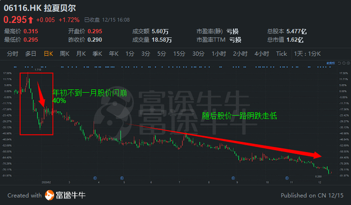 已经连续两年上市亏损后的拉夏贝尔,其A股可能存在退市的可能,其港股的市值已经不足两亿,在成仙的道路上越走越远.......