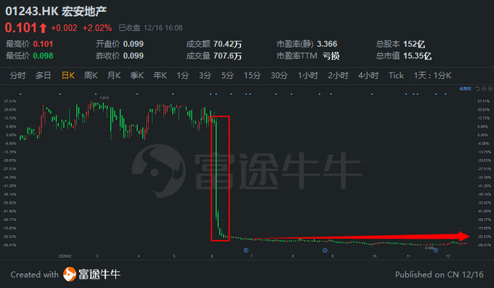 6月4日,宏安地产午后开盘没有预兆的闪崩,股价直线下挫,一日跌去69%,收盘成仙股。百亿市值的股票瞬间就被击破70亿。