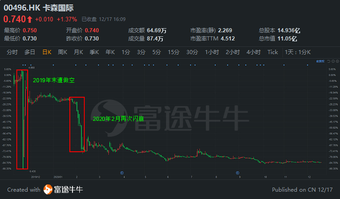 卡森国际股价在19年年末经历过山车,先暴跌90%;然后,卡森国际发布澄清公告,又暴涨478%,振幅之大,尤为夸张。