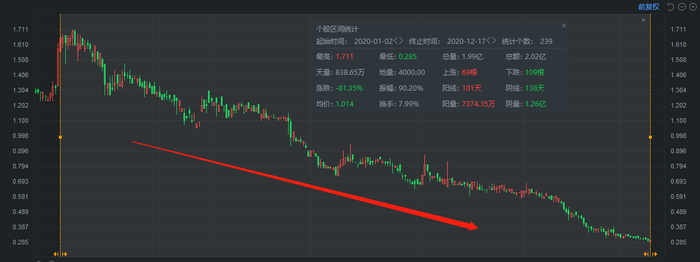 至此,卡森国际2020年过山车大戏基本收场了,随后的一年内,其股价伴随着偶尔几根20%的大阳线,不断走低,股价从高位直接跌去80%。