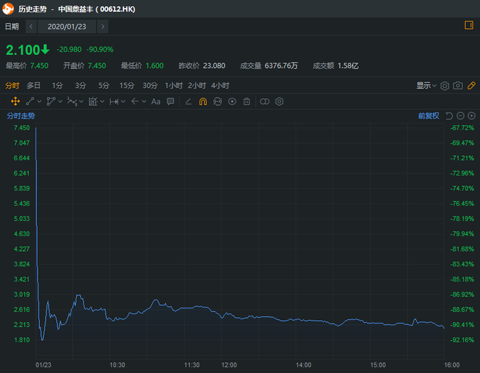 今年1月23日,停牌长达10月之久的中国鼎益丰复牌暴跌,开盘后直线下挫,最终收跌90%,股价报2.1港元,总市值25.97亿港元。