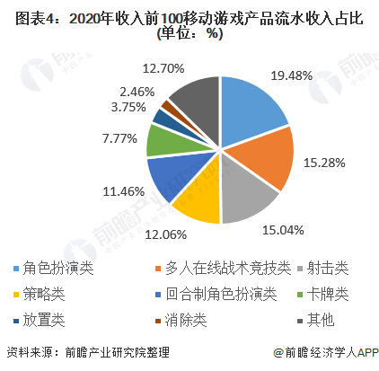 2020年,在中国移动游戏收入排名前100的产品中,角色扮演类游戏占比为19.48%;多人在线战术竞技类游戏发展迅速,市场扩张速度极快,占比为15.28%;射击类游戏仅次于多人在线战术竞技类游戏,占比为15.04%,三者占总收入的49.8%,占全部收入的近一半。
