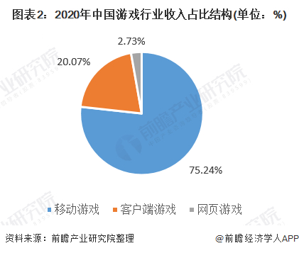 从市场份额来看,2020年,中国移动游戏市场实际销售收入占比为75.24%;客户端游戏市场实际收入占比为20.07%;网页游戏市场实际销售收入占比为2.73%,移动游戏收入占据游戏市场主要份额。
