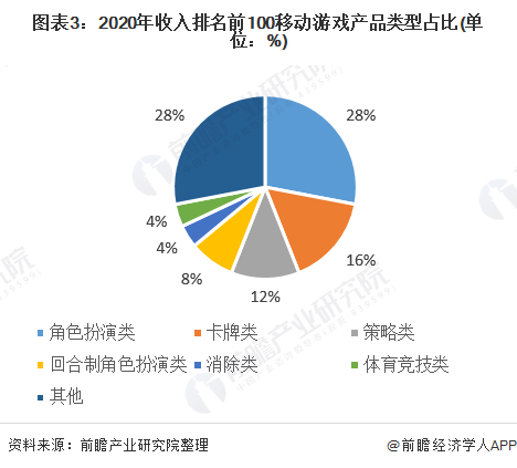 2020年,在中国移动游戏收入排名前100的产品中,游戏类型逐渐丰富,用户选择比较多,目前有三类游戏占比超过10%,分别是:角色扮演类游戏,占比为28%;卡牌类游戏,占比为16%;策略类游戏,占比为12%。
